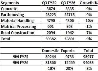Material Handling Equipment sales totaled 4,306 units, experiencing a 10% year-on-year decline in Q3 FY26, reflecting reduced activity in logistics and construction sectors.