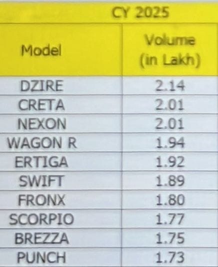 The top 10 list further reflects the shift toward higher-riding vehicles, with seven of the ten best-selling models being SUVs or SUV-derived crossovers. Models such as the Scorpio (1.77 lakh), Brezza (1.75 lakh), and Punch (1.73 lakh) reinforced the segment’s growing dominance, while the Fronx (1.80 lakh) also posted strong volumes, blurring the line between hatchback and SUV.