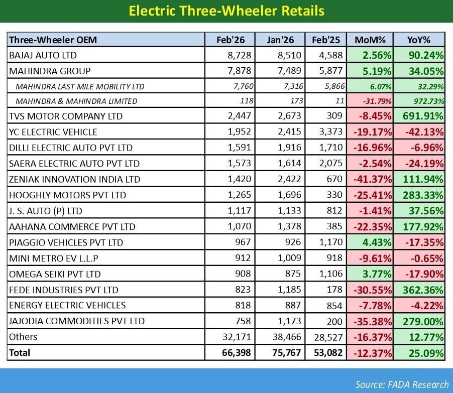 India's electric three-wheeler (E3W) retail sales declined 12.37% in February 2026 compared to January, according to data released by the Federation of Automobile Dealers Associations (FADA). A total of 66,398 units were retailed during the month, against 75,767 units in January 2026. Despite the monthly contraction, the segment posted a 25.09% increase on a year-on-year basis, compared to the 53,082 units sold in February 2025 — underscoring the segment's sustained growth trajectory over the past twelve months.