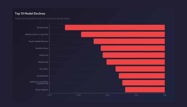 The most dramatic individual declines came from newer entrants struggling to maintain launch momentum. Mahindra's Electric Origin SUV range (BE 6e and XEV 9e) fell 43.5% from 4,842 units to 2,737 units, suggesting that the tax cuts on non-EVs continue to modulate demand for electric vehicles. The Skoda Kushaq fell 51.9% from 1,219 units to just 586 units, reflecting the Czech brand's ongoing struggles in the Indian market. Toyota's Urban Cruiser HyRyder and Rumion combined fell 37% from 14,630 units to 9,211 units.