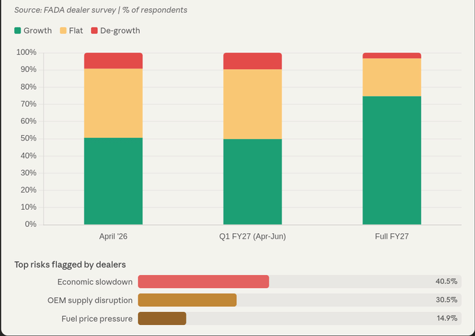 FADA's latest dealer survey paints a picture of guarded confidence. For April 2026, 50.56 per cent of dealers expect growth while 40.15 per cent anticipate flat performance — a reading that FADA President C S Vigneshwar characterises as reflecting "not pessimism but the natural recalibration that follows a record-setting March."