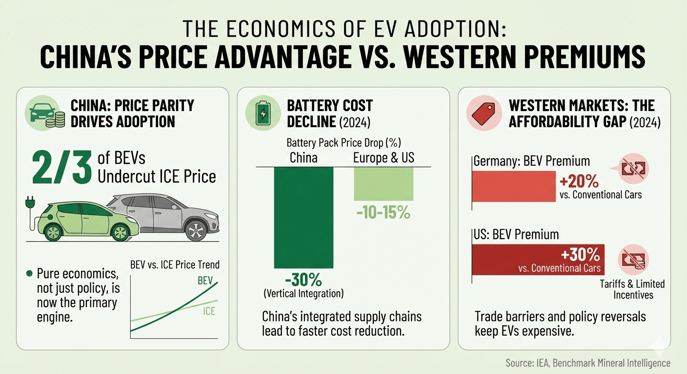 A record surge in global adoption masks a deepening rift as China achieves historic price parity while Western protectionism and policy reversals stall momentum in North America.