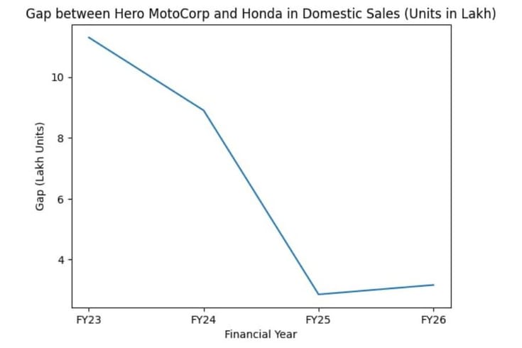In the financial year 2025, Hero’s domestic wholesales stood at about 5.61 million units, while Honda recorded domestic volumes of about 5.33 million units.