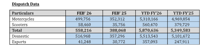The scooter segment continued to gain ground, with models including the Xoom and Destini attracting buyer interest. The 100cc–125cc motorcycle segment also contributed to overall dispatch volumes. The company dispatched 499,756 motorcycles and 58,460 scooters in February 2026, compared to 352,312 motorcycles and 35,756 scooters in February 2025.