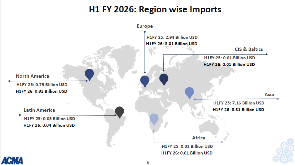 While exports to North America came down marginally by US$30 million, imports from the Asia region rose significantly by US$1.1 billion. Data shows that India’s component exports to the US were at US$3.12 billion in April–September 2025, compared to US$3.10 billion in the year-ago period. Imports from China, on the other hand, rose to US$4.05 billion from US$3.27 billion.