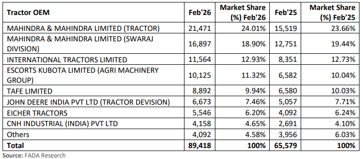In terms of manufacturer performance, Mahindra & Mahindra retained its dominant position in the tractor segment in February 2026. Its core tractor division sold 21,471 units, holding a 24.01% market share, while its Swaraj division contributed an additional 16,897 units at 18.90%, bringing the combined Mahindra group share to 42.91%. International Tractors Limited, which markets tractors under the Sonalika brand, held the second position with 11,564 units and a 12.93% share. Escorts Kubota's agri machinery group came in third at 10,125 units and 11.32%, followed by TAFE at 8,892 units (9.94%), John Deere India at 6,673 units (7.46%), and Eicher Tractors at 5,546 units (6.20%). CNH Industrial rounded out the named manufacturers with 4,158 units and a 4.65% share.