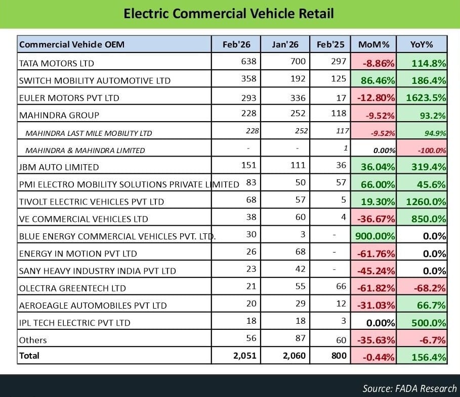 Electric commercial vehicle (ECV) retail in India stood at 2,051 units in February 2026, a marginal decline of 0.44% from 2,060 units recorded in January 2026, according to data released by the Federation of Automobile Dealers Associations (FADA). Despite the month-on-month softness, the segment posted year-on-year growth of 156.4% from 800 units in February 2025, underscoring the pace at which electric vehicles are penetrating India's commercial vehicle market.