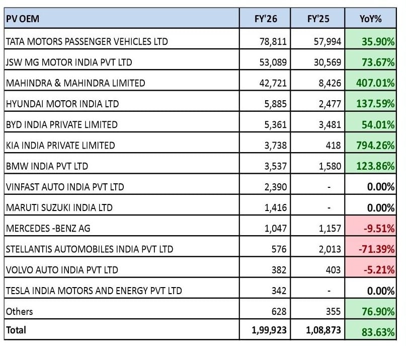 Total electric PV retails surged 83.63% to touch 1,99,923 units in FY2026, with Mahindra, MG, and Tesla marking the segment's most striking storylines of the year.