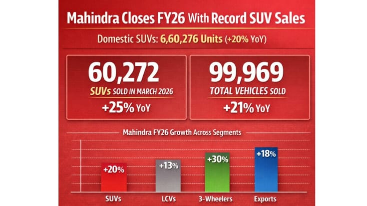 Mahindra & Mahindra reported domestic SUV sales of 60,272 units in March 2026, representing 25% year-on-year growth and marking a sequential recovery from February 2026's 60,018 units. Total auto sales for the month reached 99,969 vehicles, up 21% compared to March 2025, driven by growth across utility vehicles, commercial vehicles, and three-wheeler segments.