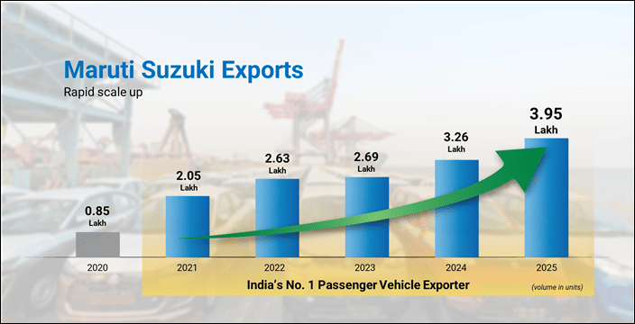 Maruti Suzuki India Limited exported 395,000 vehicles in calendar year 2025, recording a 21 percent increase over the previous year and maintaining its position as the country's leading passenger vehicle exporter for the fifth year running.