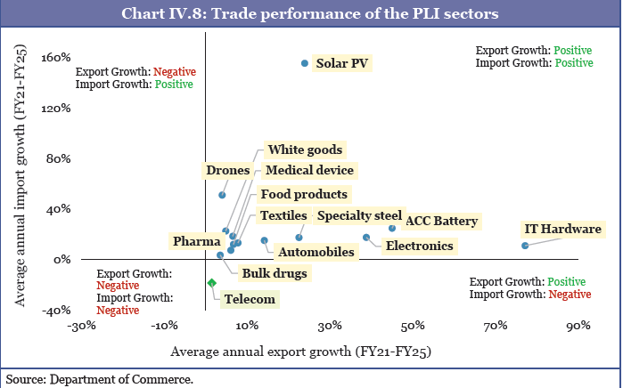 The Survey presents PLI sector trade performance in a four-quadrant matrix based on export and import growth patterns. Across all PLI sectors during FY21-FY25, exports showed an average annual growth rate (AAGR) of 10.6% while imports grew at 12.6%. However, this aggregate masks considerable variation across sectors.