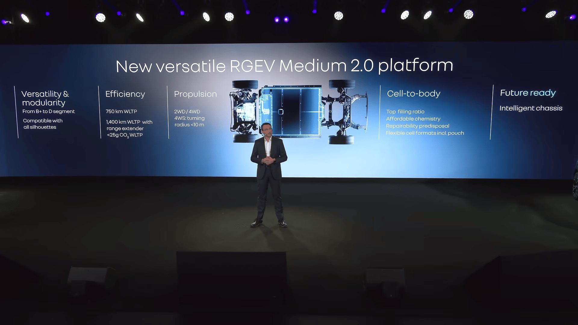 The technology centrepiece of futuREady is the RGEV Medium 2.0 electric platform, operational from 2028, covering the B-plus to D segments across saloon, SUV and MPV body styles. The group projects a 40% cost reduction against the current EV generation, a WLTP range of up to 750 km in standard form and up to 1,400 km with a range extender, and the platform will be developed primarily in France, with localisation planned in Palencia, Spain. It uses a cell-to-body battery design with a 70% fill rate (the proportion of pack volume occupied by active cells) and 20% fewer parts. French aggregate production output is expected to be 20% higher over the 2026 to 2030 period than over the preceding five years.