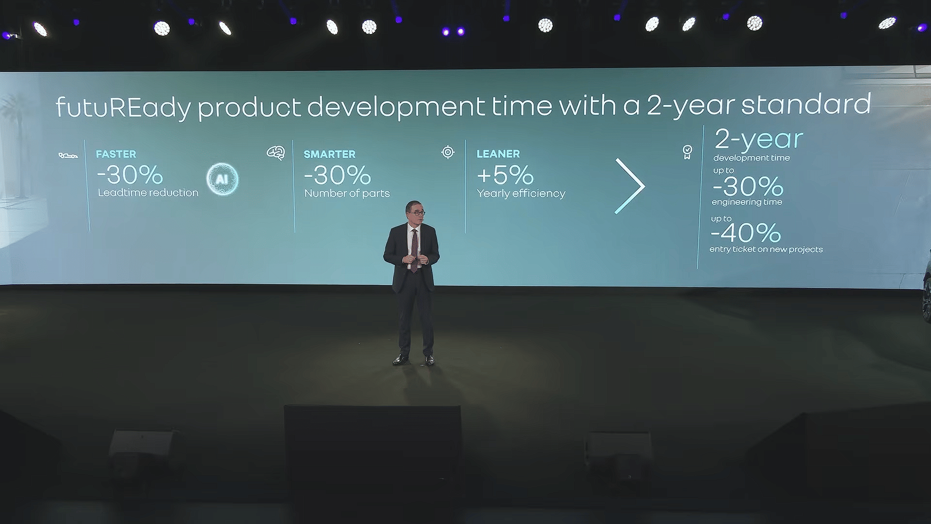 The competitive logic begins with development speed. Chief Technology Officer Philippe Brunet credited ACDC with demonstrating the viability of a two-year development cycle. The group's new One Engineering organisation, launched by Provost shortly after his appointment last July, scales that approach across three principles: faster development, using a full virtual digital twin with AI support across design and software coding; fewer parts per vehicle, with a 30% reduction through platform standardisation; and a leaner organisation with lower cost per engineering hour and a simplified R&D footprint. The combined effect is projected to reduce entry ticket costs by up to 40% compared with the previous generation and cut the cost of goods per vehicle by between 10% and 30%.