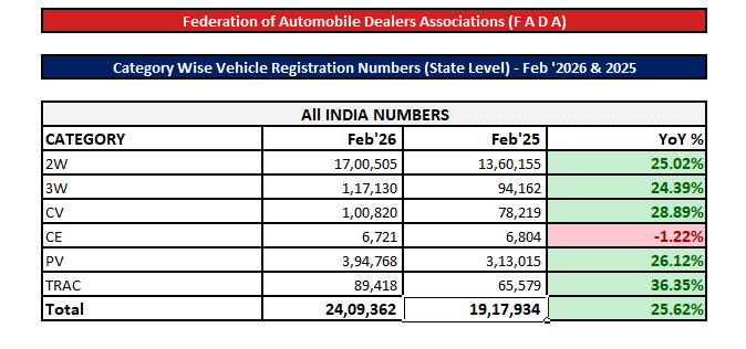 Tamil Nadu registered 2,36,271 units in February 2026, a 46.2% increase over 1,61,627 units in February 2025 — the highest percentage gain among large states. The growth was spread across categories: two-wheelers rose 45.4% to 1,83,124 units, passenger vehicles climbed 53.7% to 33,827 units, and commercial vehicles grew 51.2% to 8,786 units.