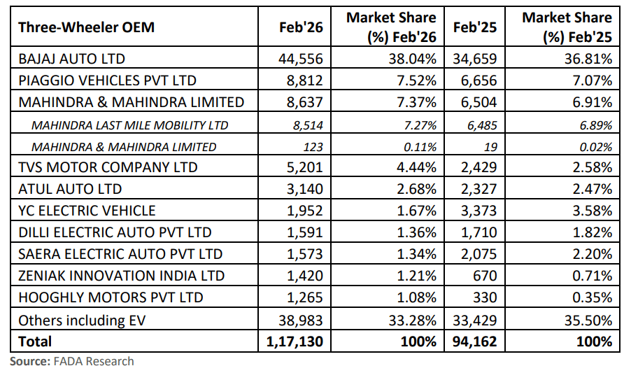In terms of OEM market share, Bajaj Auto retained its dominant position with 44,556 units sold and a 38.04% share of the segment, improving from 36.81% in February 2025. Piaggio Vehicles followed with 8,812 units and a 7.52% share. Mahindra & Mahindra sold 8,637 units (7.37%), while its subsidiary Mahindra Last Mile Mobility retailed 8,514 units (7.27%).