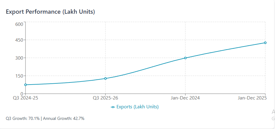 The export segment of three-wheelers has demonstrated exceptional performance, outpacing domestic growth rates significantly. Three-wheeler exports posted strong growth of 70.1% in Q3 of 2025-26, with approximately 1.27 lakh units shipped to international markets compared to Q3 of the previous year.