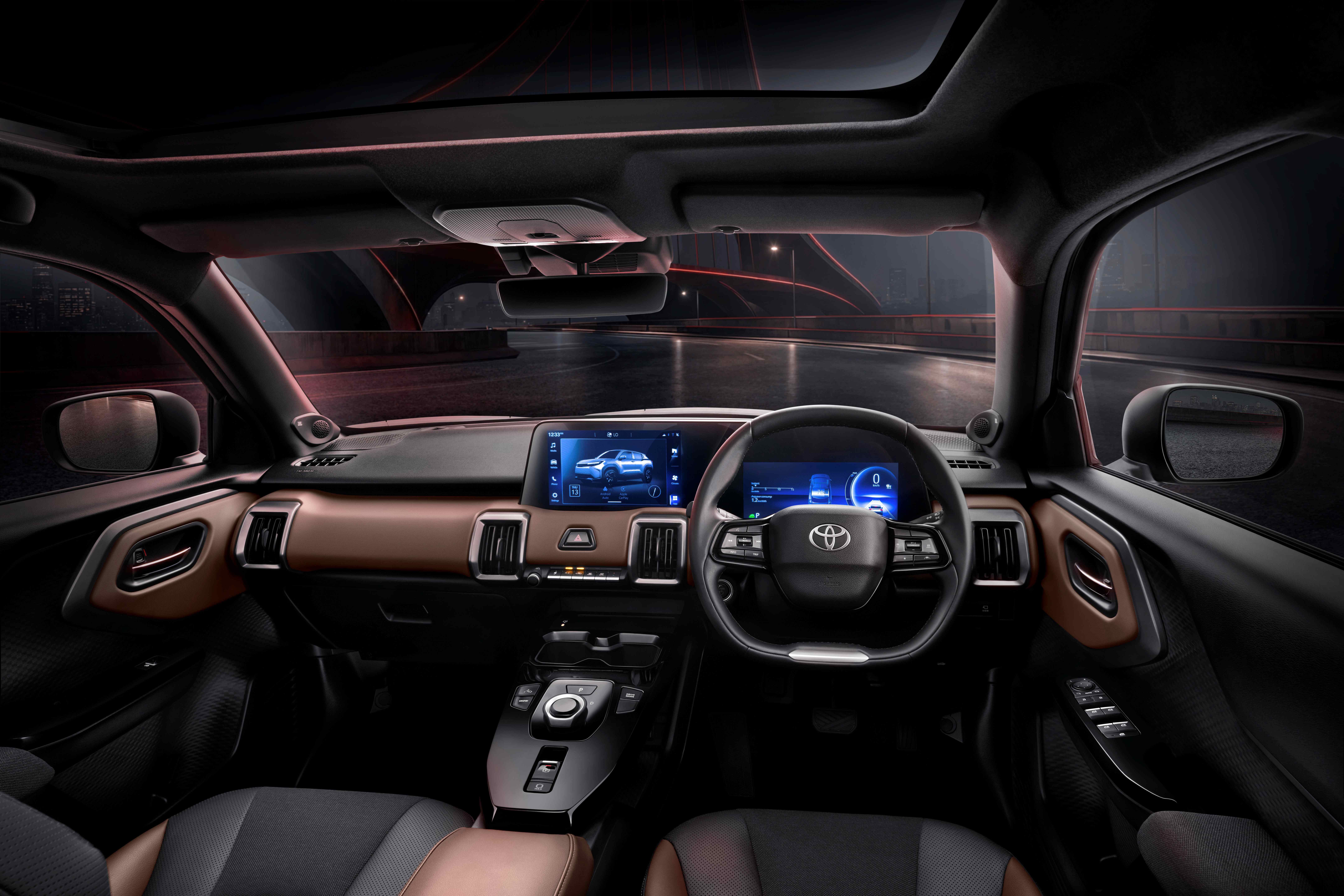 The Urban Cruiser EV differentiates itself from the e-Vitara through a redesigned front fascia featuring Toyota's signature Hammerhead design and sleeker LED headlights with DRLs. At the rear, it features different LED light signatures in the wraparound taillights. The interior features a dual-screen setup comprising a 10.25-inch digital driver display and a 10.1-inch touchscreen infotainment system paired with JBL speakers.