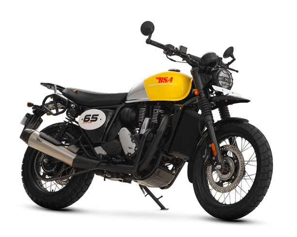 The BSA Scrambler 650 utilizes a bigger 650cc single-cylinder engine that generates 45 bhp and 55 Nm of torque at 4,000 rpm. The motorcycle's design incorporates a sculpted fuel tank with chrome accents, a flat ribbed bench seat, and an exposed subframe. Buyers can select from three color variants including Raven Black, Victor Yellow, and Thunder Grey. The BSA model is priced from Rs 3,24,950.
