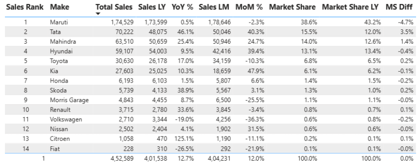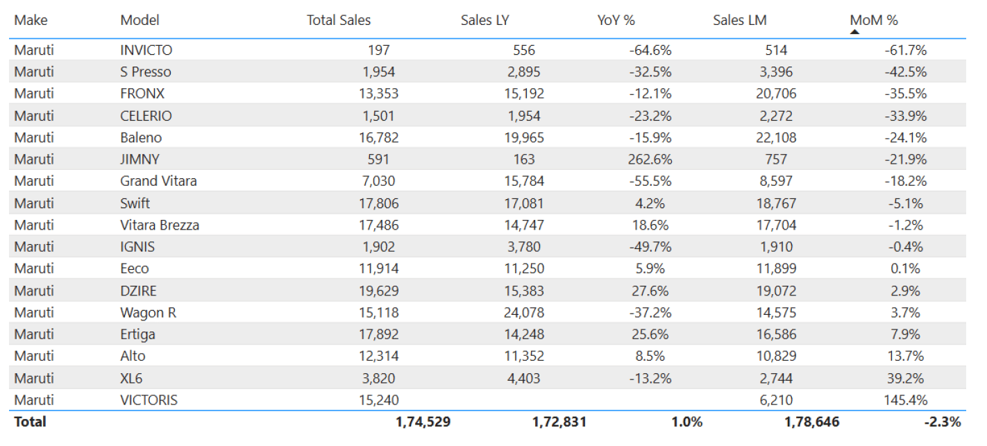 Maruti back in the below 40% market share this month. This is despite the brilliant performance of the newly released Victoris. This is because of the huge fall in sales MoM in the Baleno, Fronx, and also the Grand Vitara.