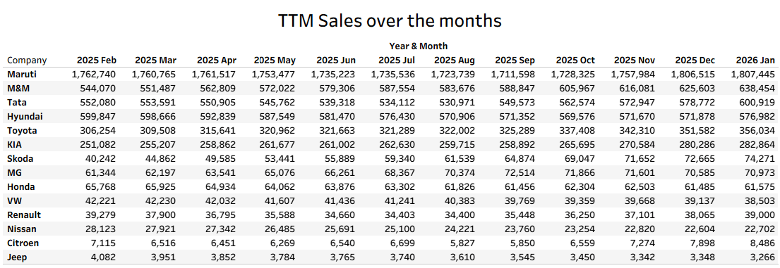 2. Tata has crossed 600k in TTM sales for the very first time and is performing very strongly with new brilliant models in place. Last January TTM sales were 556k. They have gained almost 50k in TTM sales just in 12 months. For context Hyundai actually are down from 600k to 576k