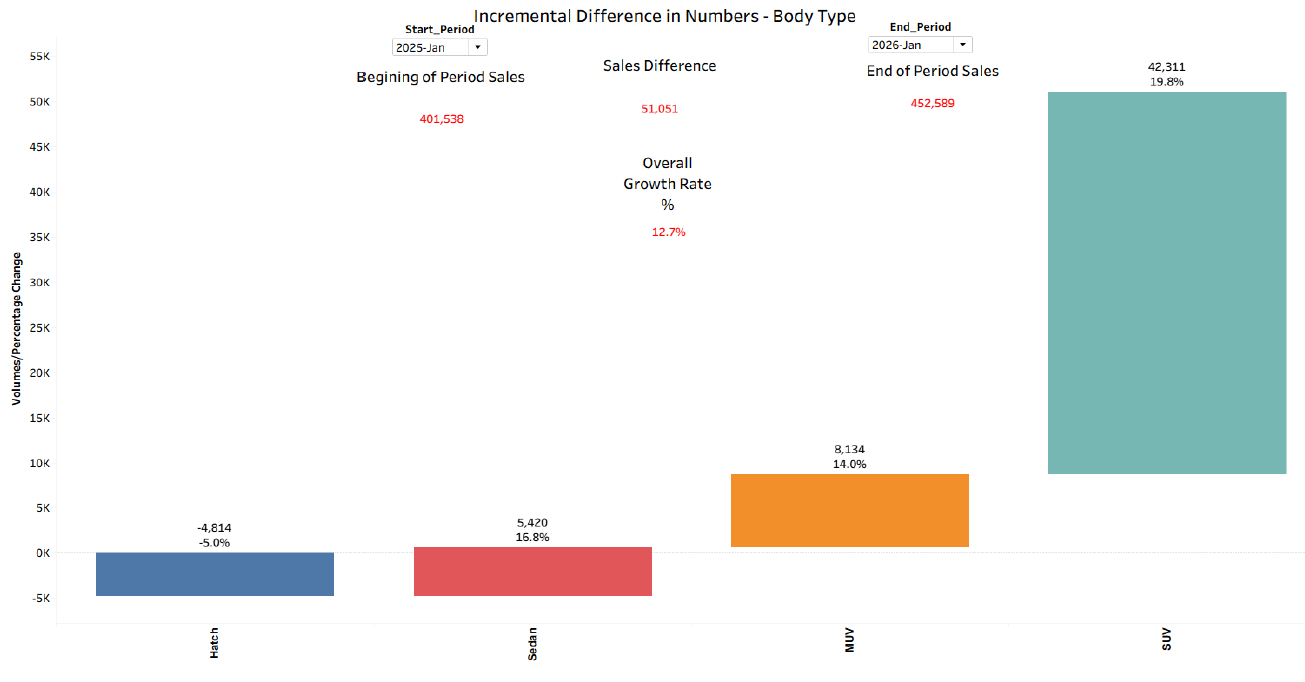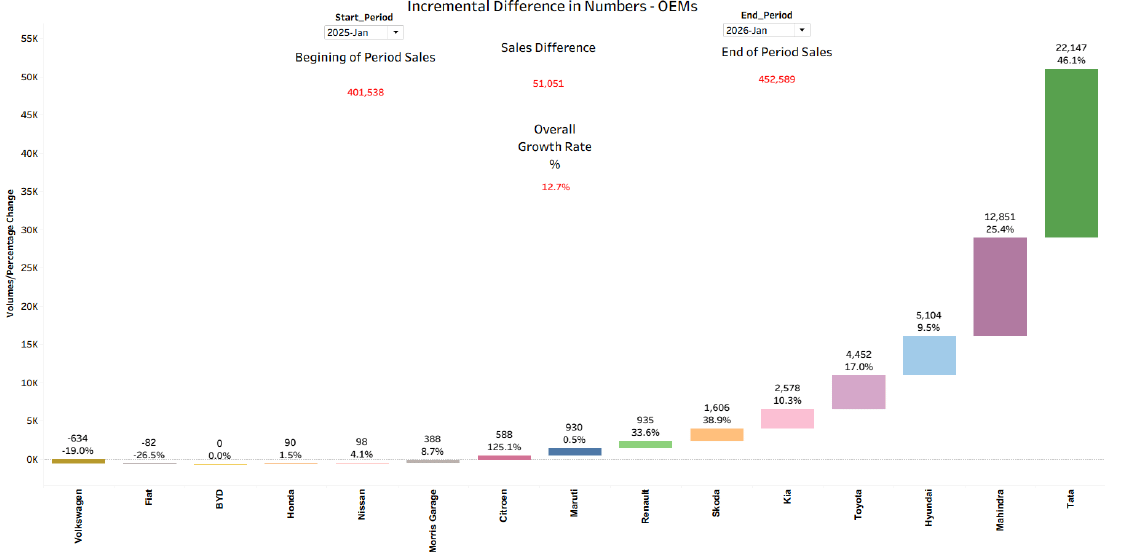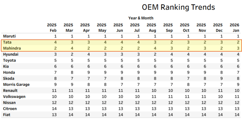 Indian auto market crosses 4.6 million units with 13% January growth, as Tata and Mahindra battle for second place behind Maruti, with SUVs driving 80% of overall volume expansion.
