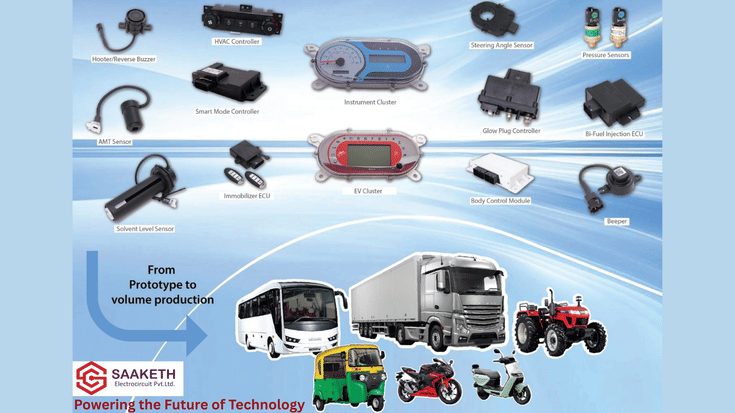 With 30+ years in automotive electronics—from ignition systems to connected EVs—Saaketh Electrocircuit delivers lifecycle-driven engineering: robust design, sustainable components, manufacturability, validation, and serviceability. Our integrated IATF 16949/ISO 9001 ecosystem unites concept-to-manufacturing with in-house SMT, EOL testing, environmental labs, and rapid prototyping for faster cycles and first-time-right quality. EV portfolio: BLDC controllers, DC-DC converters, BMS, VCUs, digital clusters—backed by OEM partnerships, patented ASIC ECUs, and IoT smart controllers for India. We co-develop enduring platforms from prototype to volume.